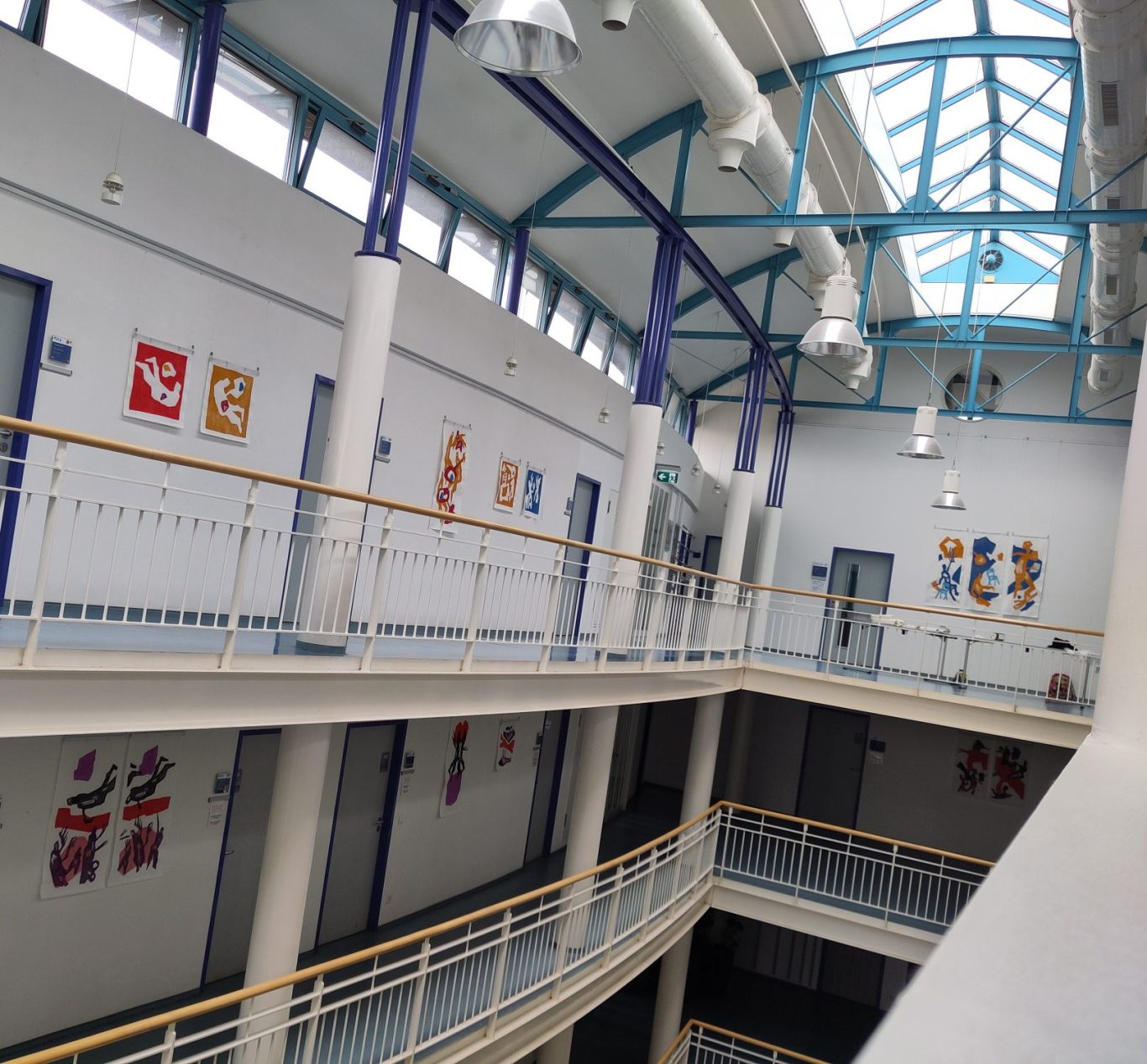 Im Atrium hängen sich die verschiedenen Perspektiven über drei Stockwerke gegenüber; im 3. Stock verbinden sie sich als positive Erfahrung an der Stirnseite.